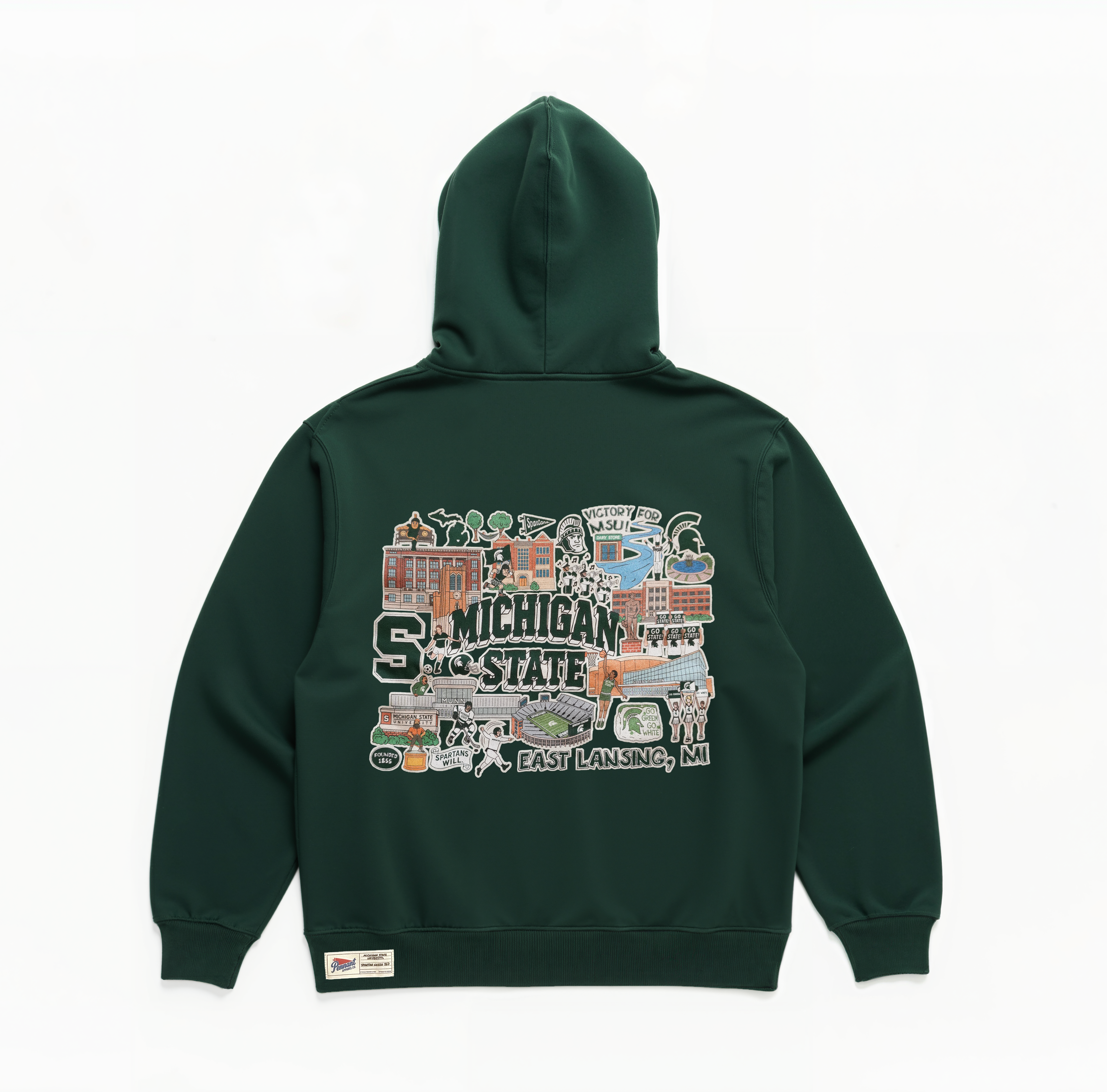 The hand-drawn back design captures the spirit of campus life, highlighting iconic landmarks, historic buildings, unforgettable sports moments, and the symbols that define your university pride. The artwork, along with the neck and hem tags, have a soft vintage fade that adds a timeless, worn-in feel.