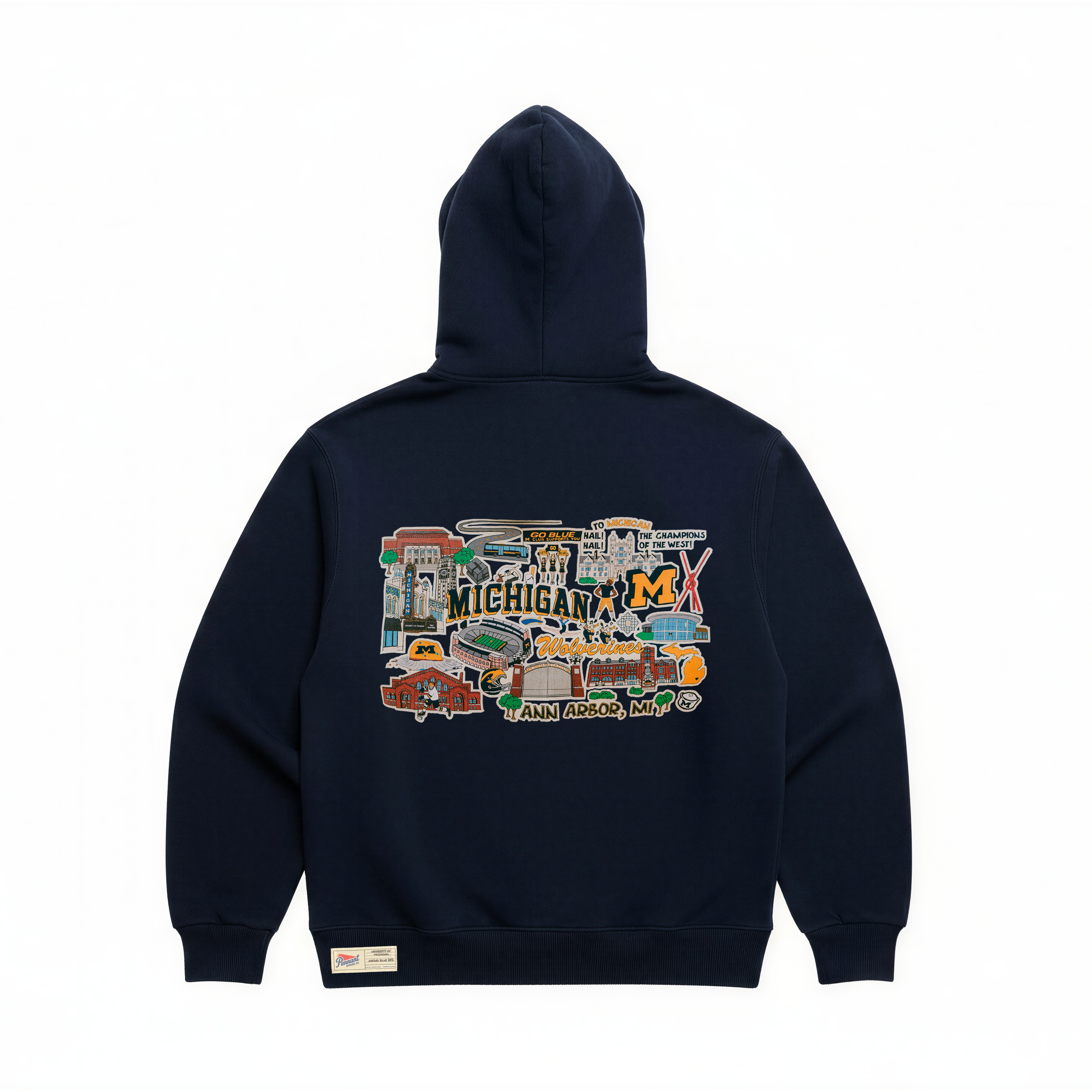 The hand-drawn back design captures the spirit of campus life, highlighting iconic landmarks, historic buildings, unforgettable sports moments, and the symbols that define your university pride. The artwork, along with the neck and hem tags, have a soft vintage fade that adds a timeless, worn-in feel.